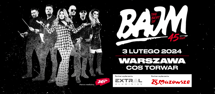 Fenomen zespołu Bajm to właśnie ponadczasowa muzyka i emocje, które łączą pokolenia. Ich hity bujają wszystkich bez wyjątku. A głos Beaty przeszywa i przyprawia o gęsią skórkę nawet największych twardzieli. Trasa 45-lecia to muzyczna podróż przed dekady polskiej muzyki. Usłyszycie „ejtisowe” przeboje, rockowe hity lat 90-tych i romantyczne ballady, które wszyscy znamy i uwielbiamy. A nie ma nic bardziej porywającego jak przeboje śpiewane przez tysiące gardeł na największych arenach w Polsce. Wyobrażacie sobie te porażającą siłę?. „Co mi Panie dasz” czy „Józek nie daruje Ci tej nocy” to już hymny naszych czasów! A Bajm to nie tylko muzyka, to przede wszystkim spektakl z fantastyczną oprawą wizualną, która przeniesie Was do świata emocji i zabawy na ponad dwie godziny. Brzmienie Bajmu i produkcja to zasługa współzałożyciela i twórcy sukcesu Bajmu, Andrzeja Pietrasa. A energia zespołu sprawi, że wstaniecie z miejsc i od pierwszych dźwięków wszyscy razem zaśpiewamy: JESTEŚ STEEEREM BIAŁYM ŻOŁNIERZEM… !!! Czy jesteście gotowi na taką jazdę? Ta podróż rozpoczyna się na warszawskim Torwarze już 3 lutego. Partnerem Wydarzenia jest Samorząd Województwa Mazowieckiego.