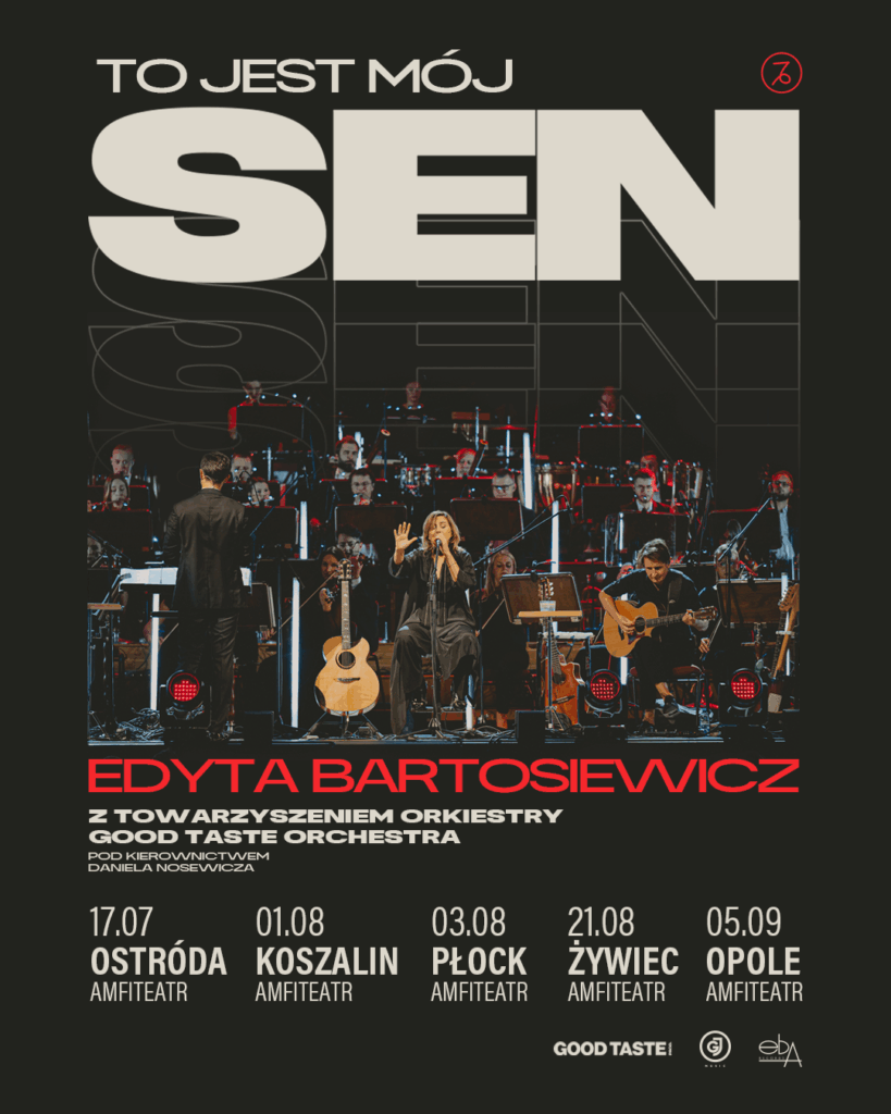 Edyta Bartosiewicz kontynuuje doskonale przyjętą przez fanów i media jubileuszową trasę koncertową z okazji 30-lecia albumu „Sen”. W wakacje Artystka wspólnie z Good Taste Orchestra zagra pięć koncertów w amfiteatrach pod kierownictwem Daniela Nosewicza. Orkiestrowych aranżacji jej największych przebojów będzie można posłuchać w Ostródzie, Koszalinie, Płocku, Żywcu i Opolu.