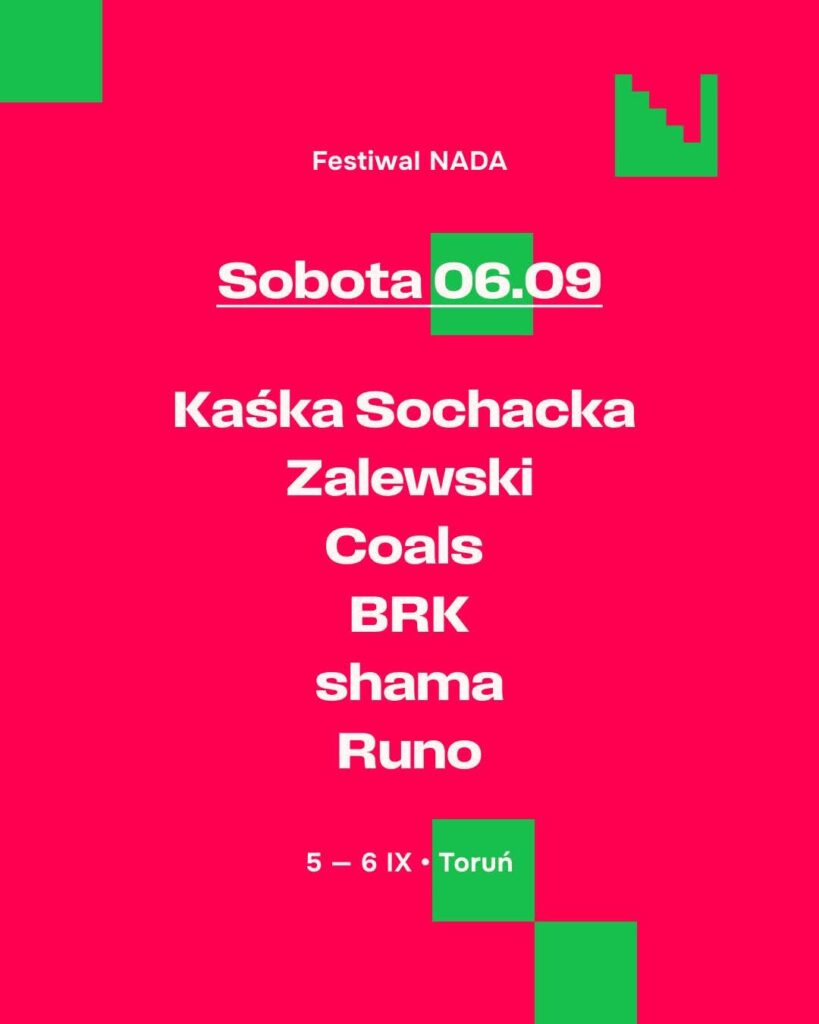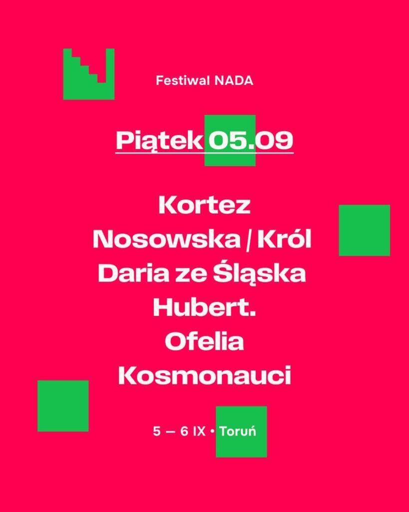 Początek września to idealny czas na wypad do Torunia. To tam w pierwszy weekend odbędzie się kolejna edycja festiwalu NADA. Podczas dwudniowej imprezy zagrają min. Zalewski, Kaśka Sochacka, Kortez, Daria ze Śląska, Hubert.