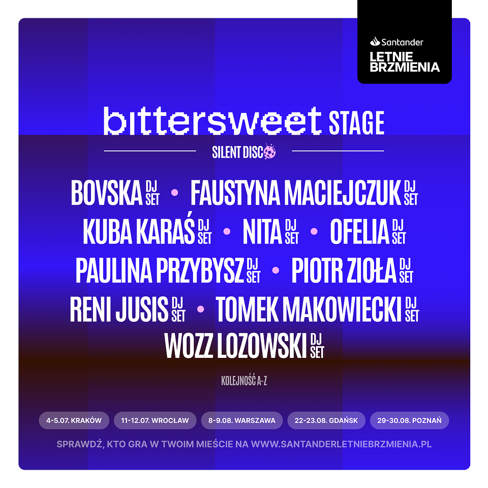 Wieczorem BitterSweet Stage stanie się przestrzenią do nieskrępowanej zabawy w rytm ulubionej muzyki płynącej ze słuchawek silent disco. Na scenie w pięciu miastach zagrają czołowe polskie nazwiska, uwielbiani przez publiczność artyści, m.in. Reni Jusis, Tomasz Makowiecki, Kuba Karaś, Paulina Przybysz, Wozz Lozowski, Nita, Piotr Zioła, Bovska, Faustyna Maciejczuk oraz Ofelia. Pełen harmonogram festiwalu wraz z informacją, kto wystąpi w danym mieście można znaleźć na www.santanderletniebrzmienia.pl.