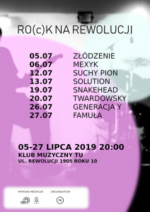 Począwszy od 5 lipca, przez cztery kolejne weekendy TU będzie gościł zespoły wybitnie rockowe. Niektóre z nich znacie już za sprawą New York Festiwal. Na klubowej scenie wystąpią: Mexyk, Solution, Złódzenie, Twardowsky, Suchy Pion, Generacja Y, Famuła, Snakehead.