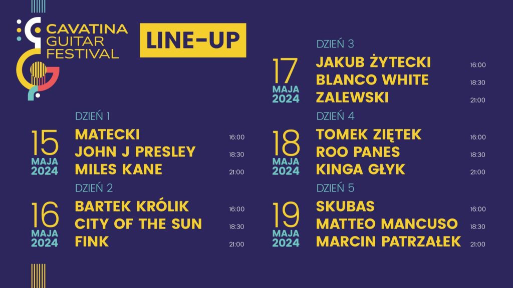Przypomnijmy, że wśród zapowiedzianych artystów, którzy uświetnią Cavatina Guitar Festival, znajdują się zarówno znane osobistości międzynarodowej sceny muzycznej, jak i cenione gwiazdy polskiej muzyki: FINK, Miles Kane, Marcin Patrzałek, Kinga Głyk, JohnJ Preslay, Blanco White, a także Krzysztof Zalewski, Roo Panes, Matteo Mancuso Trio, Jakub Żytecki, Tomek Ziętek, Lesław Matecki, Robert Cichy, czy Skubas.